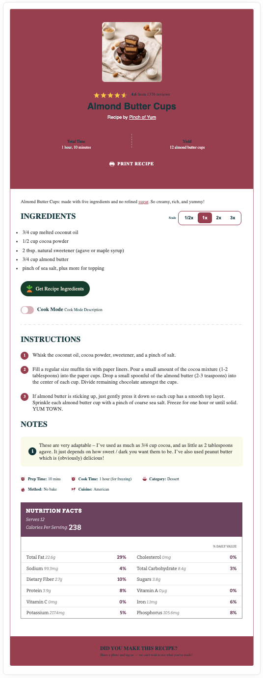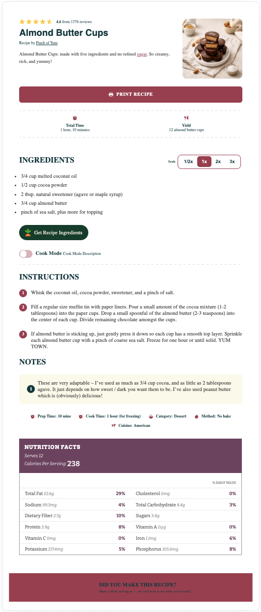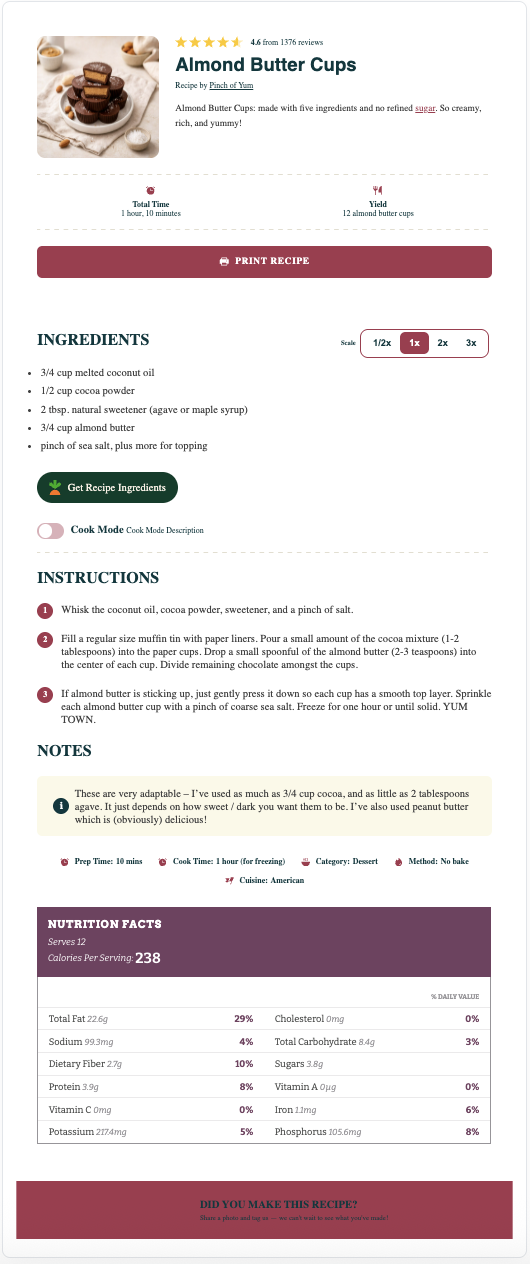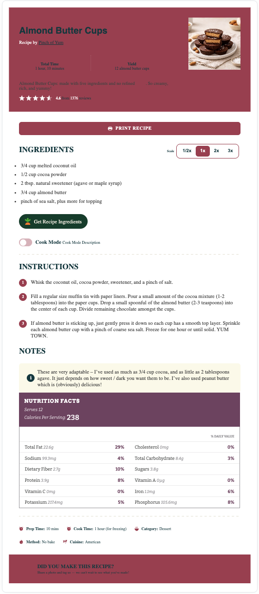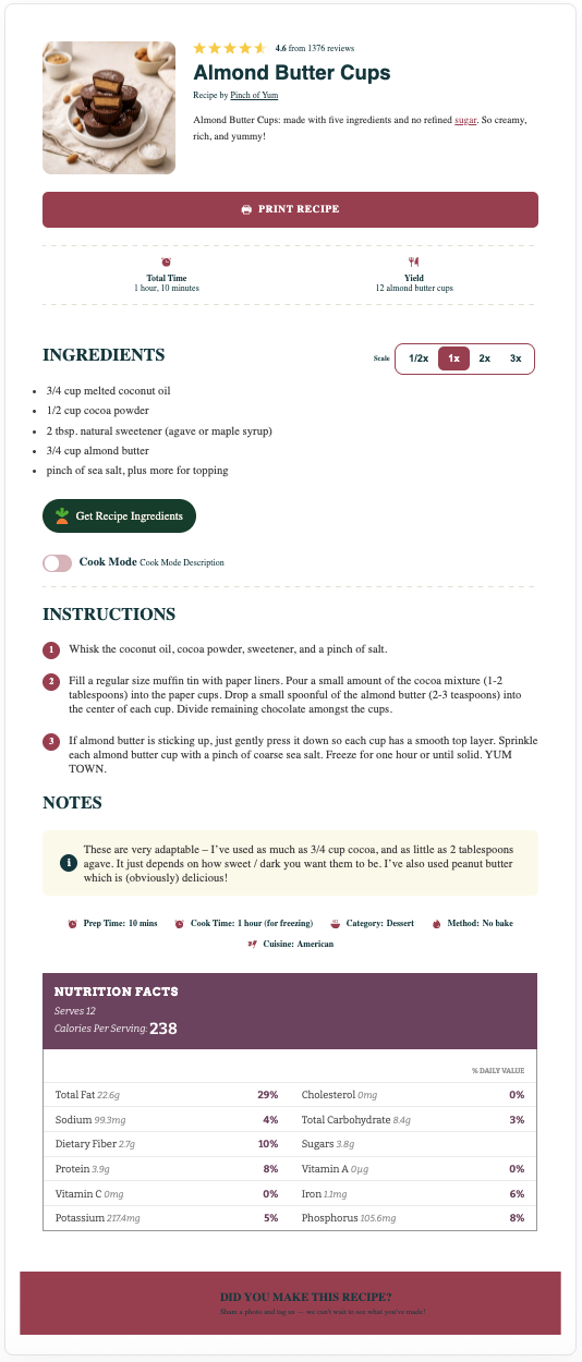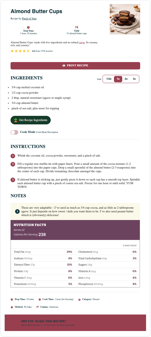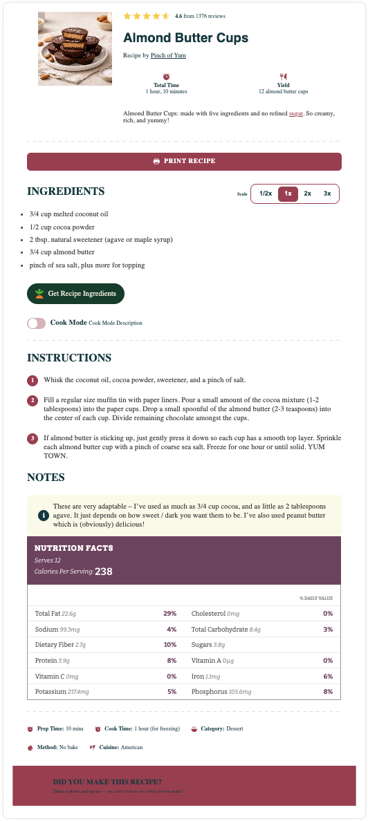 The Elegant recipe card has a light-grey background (can be set to match your theme), modified recipe details, capitalized headers, and smaller fonts for the notes and nutrition information. This template is only available to Pro users.