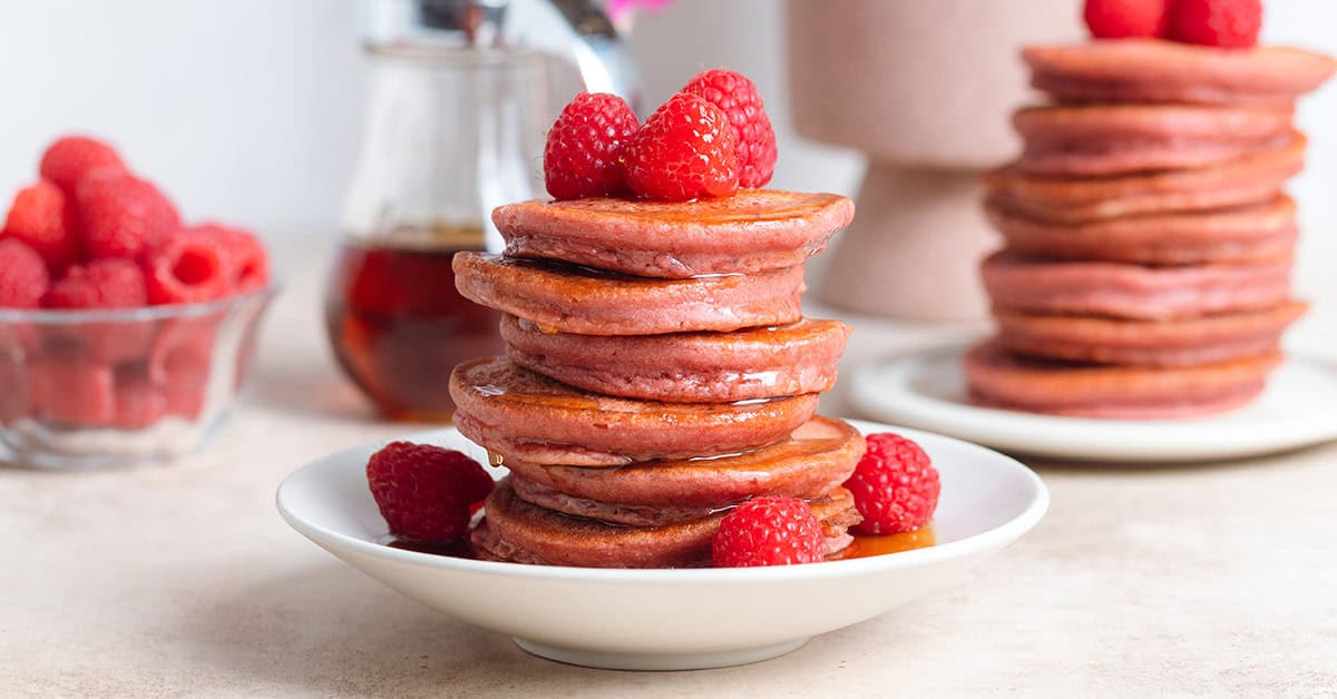 Beets give the pancakes a beautiful pink hue and make them great for Valentine's Day! Serve for breakfast or brunch.